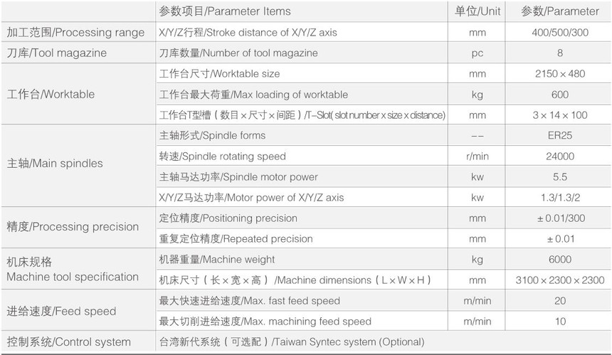 技術亮(liang)點: Technical highlights: 1、 全機采用GB-HT300樹脂砂(sha)造型鑄件,經回火(huo)處理和自然時效(xiao)處理消除内應💰力(lì)。 The whole machine adopts GB-HT300 resin sand molding castings, which are treated with fire and natural aging to eliminate internal stress. 2、 内(nèi)藏式配重:配重附(fù)導杆,上下移動時(shí)配重不晃動📐。 Built-in counterweight: the counterweight is attached with a guide rod, and the counterweight does not shake when moving up and down. 3、 各滑動(dong)面使用自動潤滑(hua)泵裝置,确保機床(chuang)的使用壽命。 Each sliding surface uses an automatic lubrication pump device to ensure the service life of the machine . 4、 全密封(fēng)钣金,操作方便,防(fang)水效果安全性好(hao)。 Fully sealed sheet metal, easy to operate, waterproof and safe.